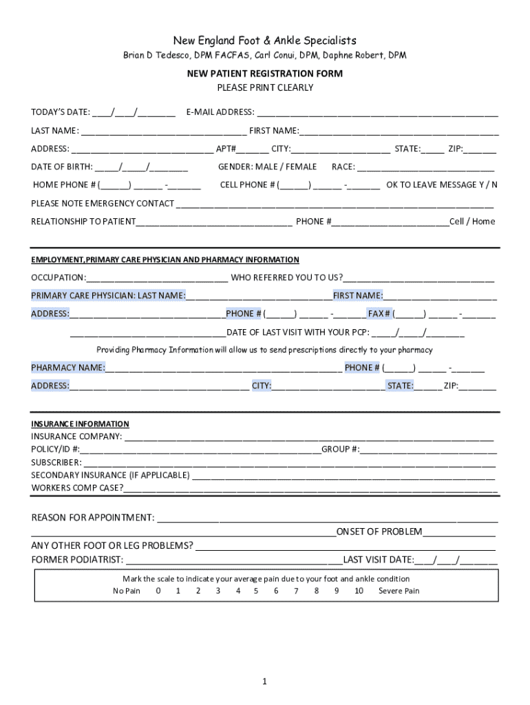 This document is a registration form for new patients at New England Foot & Ankle Specialists. It collects essential information such as personal details, medical history, insurance information, and