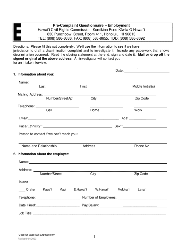 The importance of the pre-complaint questionnaire cannot be overstated, especially in employment discrimination cases where timing and detailed information play critical roles. Accurately completing this form helps in clarifying the circumstances and specifics surrounding the discrimination, thereby setting the stage for any potential legal recourse.