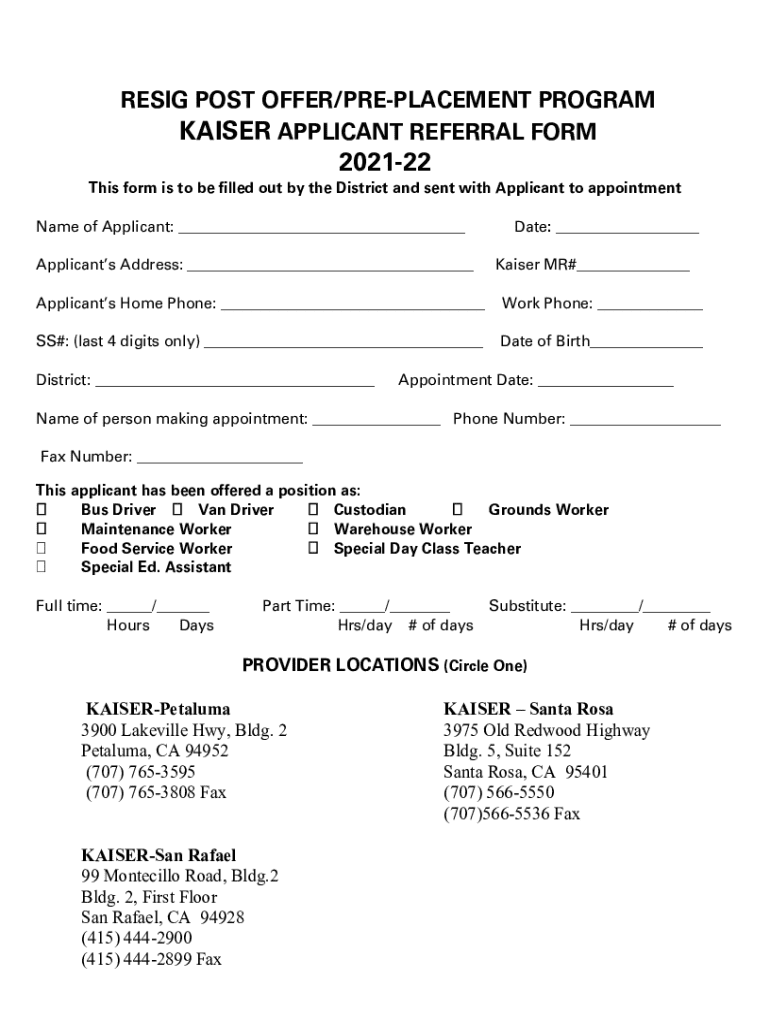 The referral process not only enhances the quality of applicants but also fosters a sense of community and cooperation within the organization. When an employee refers someone they know personally or professionally, it increases the likelihood of a strong cultural fit. The Kaiser applicant referral form serves as a standardized medium for relaying this information effectively.