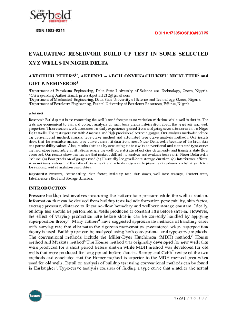 This document discusses the evaluation of reservoir buildup tests conducted in selected wells in the Niger Delta, analyzing the factors affecting these tests and the methodologies used for analysis.
