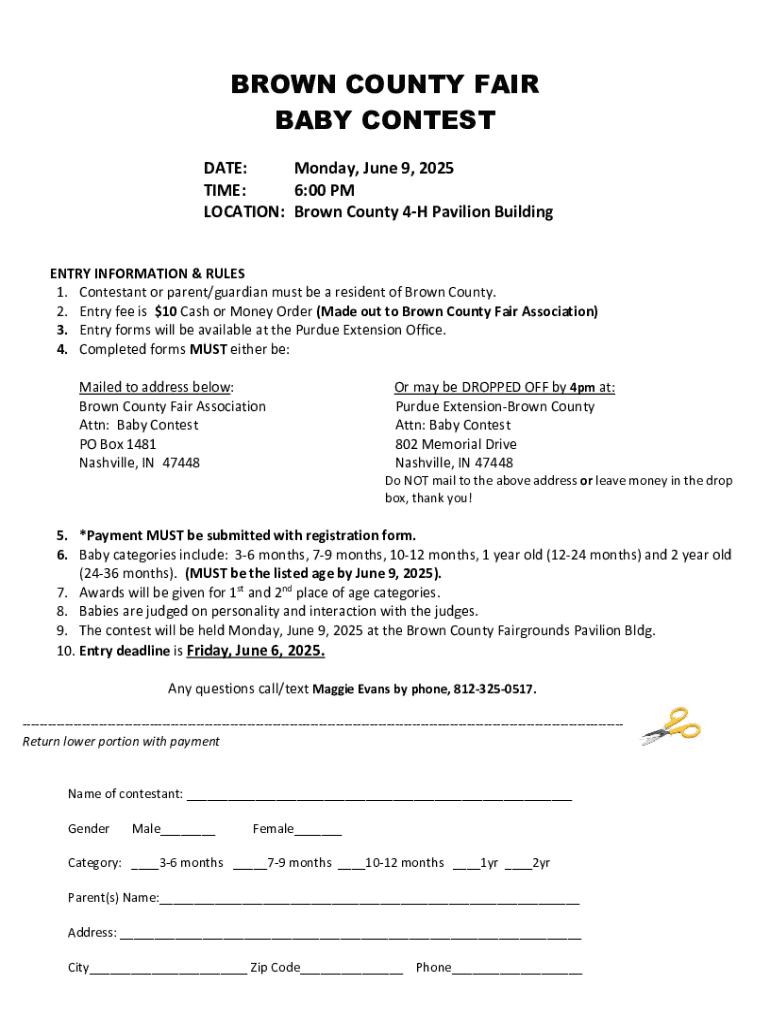 The Brown County Fair baby form serves as a gateway for infants and toddlers wishing to participate in one of the most cherished family traditions of the Brown County Fair. This form is not merely a requirement; it plays a pivotal role in ensuring that the contest runs smoothly and efficiently. Contest organizers rely on this form to gather pertinent demographic information and facilitate the lineup for each age category in the baby contest.