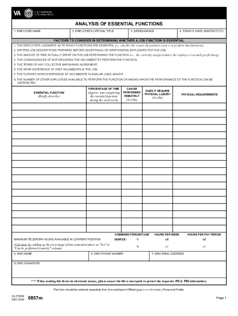 This document is used to analyze the essential functions of an employee\'s job and determine the requirements for performance, remote work capability, and physical labor involvement.