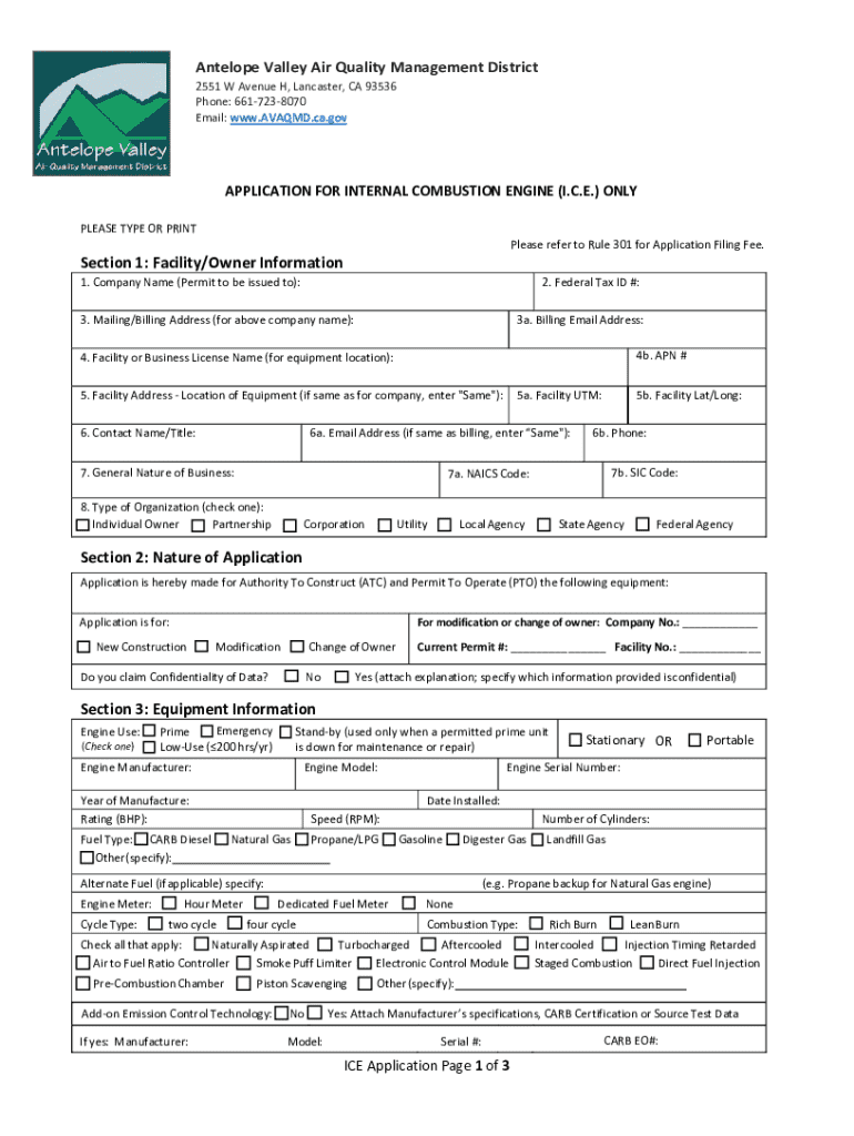This document serves as an application for obtaining Authority To Construct (ATC) and Permit To Operate (PTO) for internal combustion engines to be used at specified facilities in compliance with