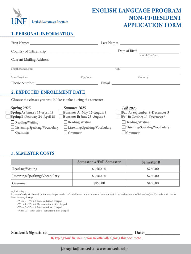 This document is an application form for non-F1 resident students to enroll in the English Language Program, detailing personal information, expected enrollment dates, and semester costs.