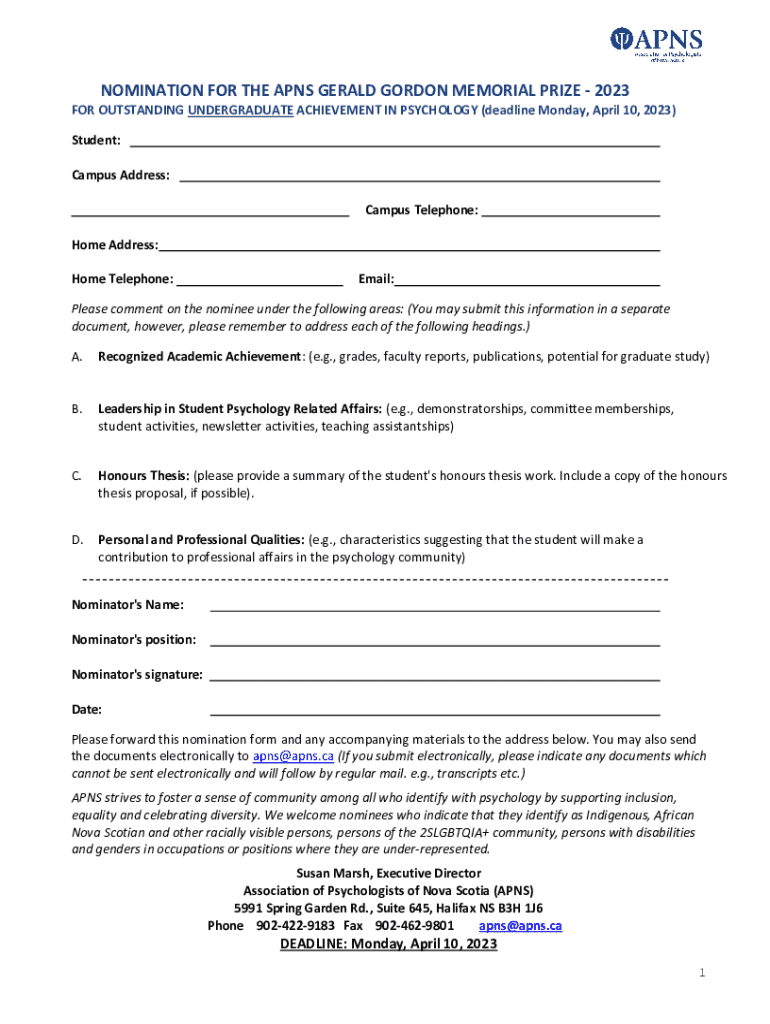 Get the free Nomination for the Apns Gerald Gordon Memorial Prize - 2023