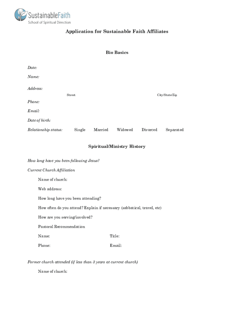 This document serves as an application form for individuals seeking to become affiliates of Sustainable Faith, focusing on their spiritual background, training, and desire to minister to others.