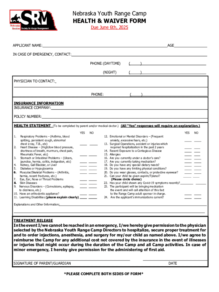 Get the free Nebraska Youth Range Camp Health & Waiver Form