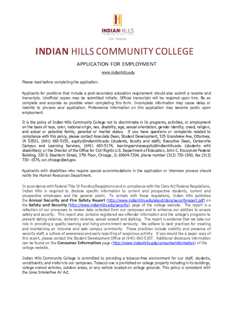 This document serves as an application for employment at Indian Hills Community College, detailing the necessary applicant information, educational background, references, previous employment, and