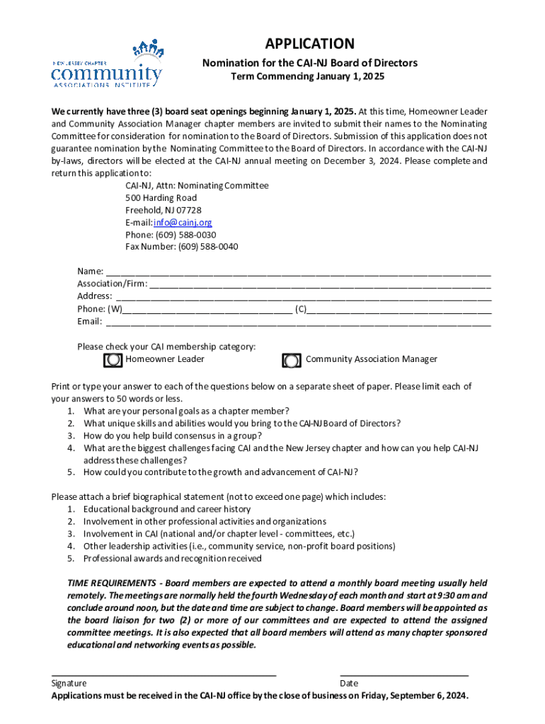 Get the free Nomination for the Cai-nj Board of Directors