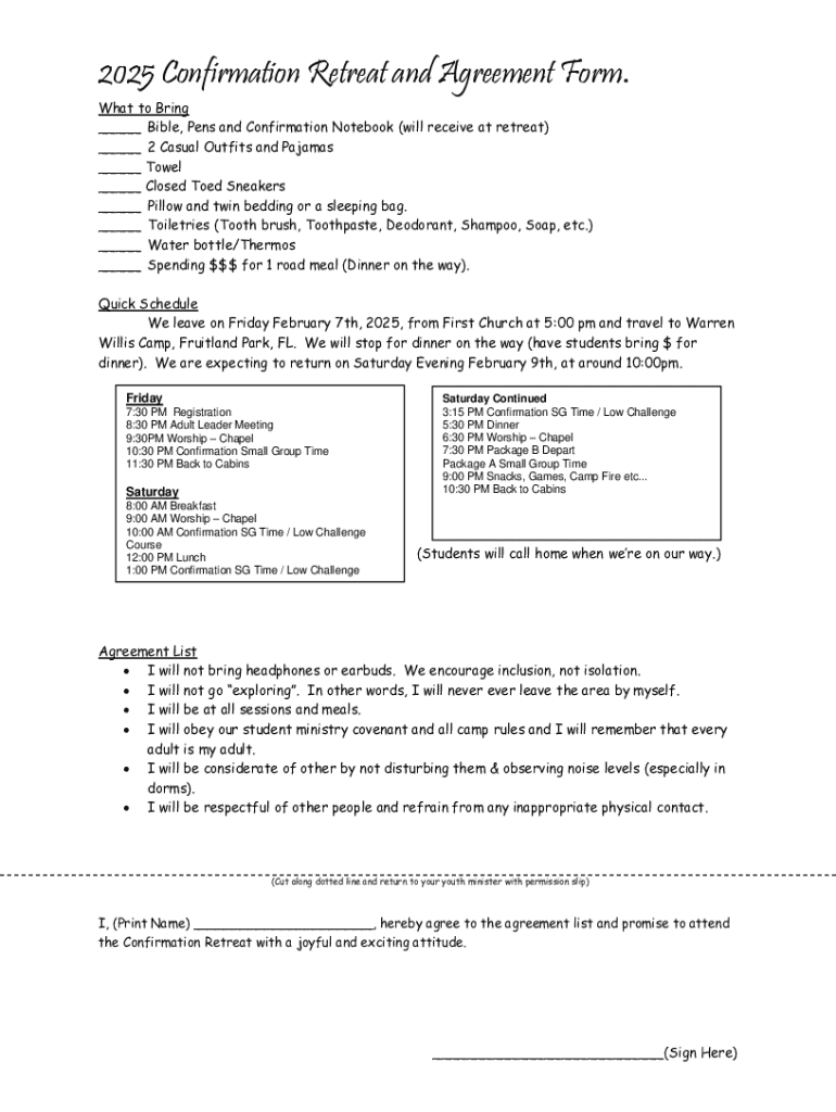FL First United Methodist Church Confirmation Retreat and Agreement Form 2025-2026 free printable template
