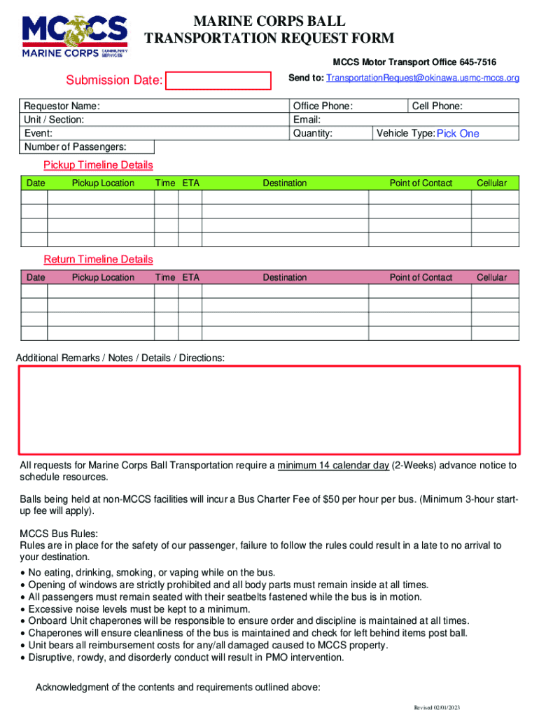 Transportation arrangements play a crucial role in ensuring that all participants arrive at the event smoothly and punctually. The Marine Corps Ball transportation form is designed to facilitate these arrangements, allowing organizers to efficiently plan and provide the necessary transportation resources.