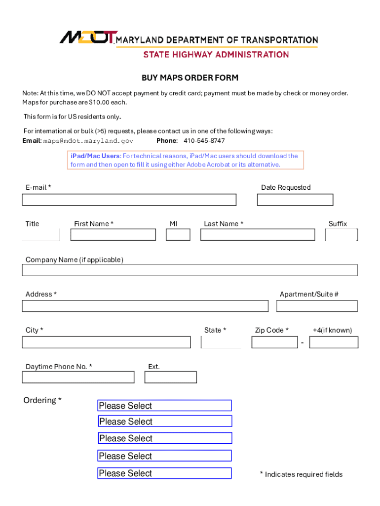 A maps order form is a specialized document designed to facilitate the purchase of various types of maps. Whether you're looking for geographic, thematic, or custom maps, this form streamlines the ordering process, allowing individuals and teams to specify their needs efficiently. By utilizing a structured format, users are guided through the essential information required to process their orders seamlessly.