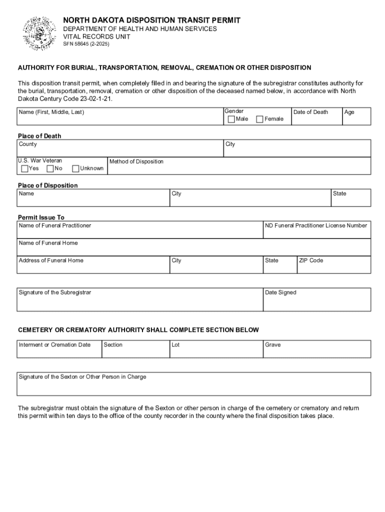 Submitting the North Dakota disposition transit form to the relevant authorities is the crucial last step in the process. It’s essential to follow specific filing procedures to ensure compliance with state regulations. Submit the completed form to the designated funerary entities, such as the funeral home or legislative offices, according to your locality’s requirements.