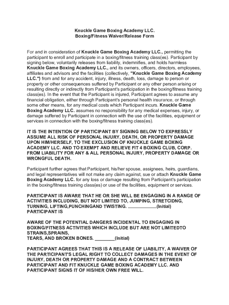 This document is a waiver and release form for participants enrolling in boxing and fitness training classes at Knuckle Game Boxing Academy LLC., outlining the assumptions of risk and liability waivers