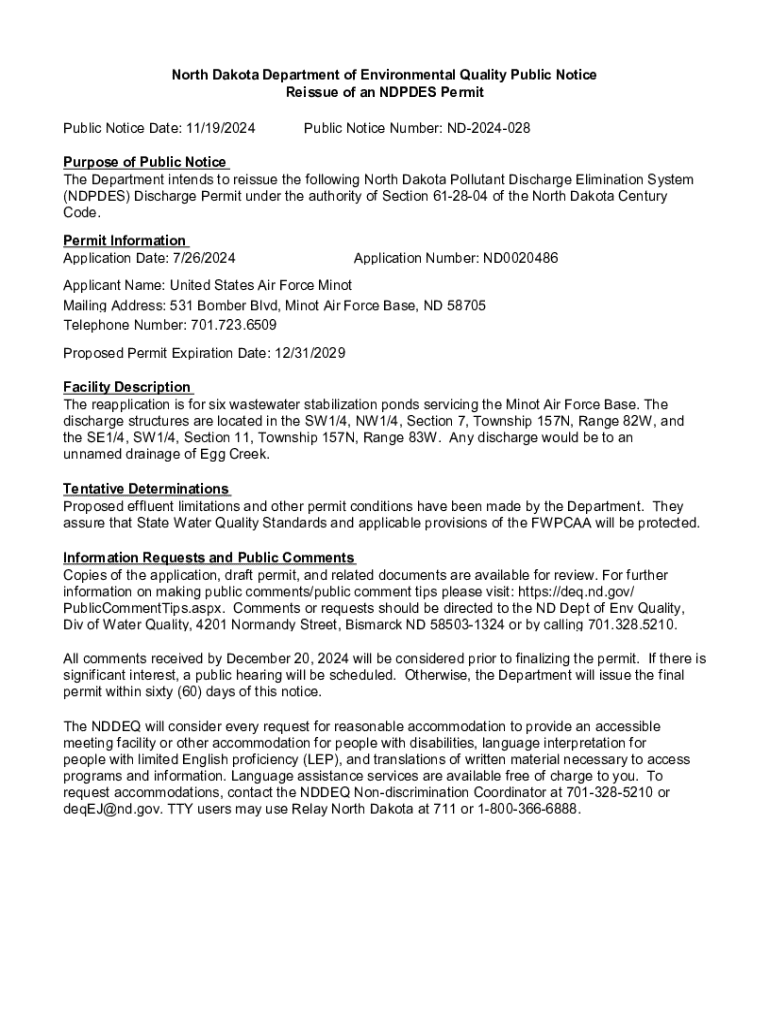 This document serves as a public notice regarding the reissuance of a North Dakota Pollutant Discharge Elimination System (NDPDES) permit for the United States Air Force Minot at the Minot Air Force
