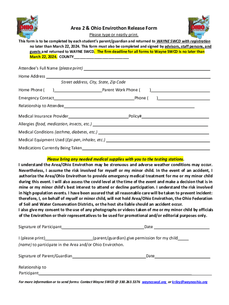 Get the free Area 2 & Ohio Envirothon Release Form