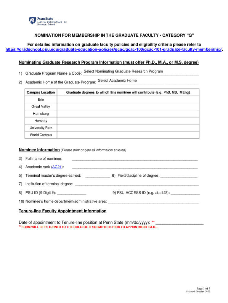 Get the free Nomination for Membership in the Graduate Faculty - Category “q” - gradschool psu