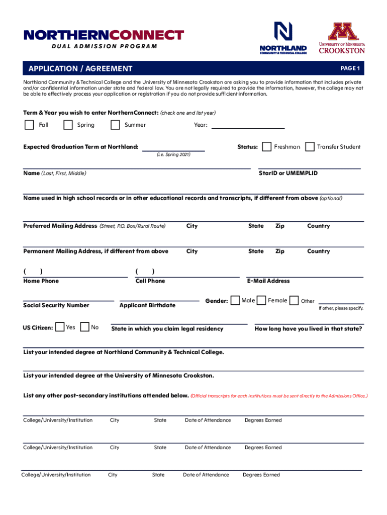 This document is an application and agreement form for the NorthernConnect dual admission program between Northland Community & Technical College and the University of Minnesota Crookston, requesting