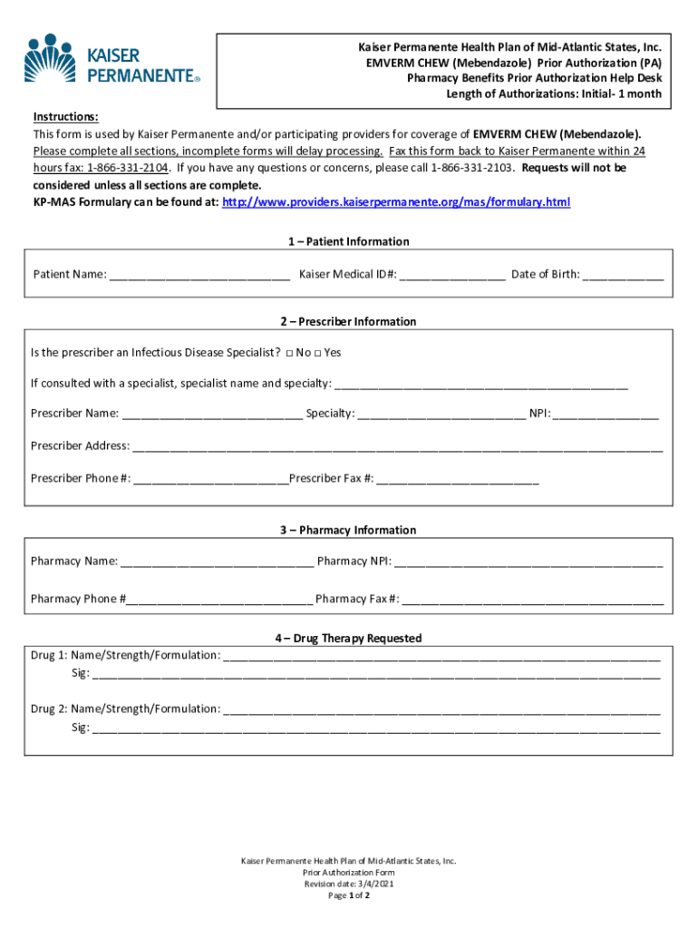 Get the free Kaiser Permanente Emverm Chew () Prior Authorization