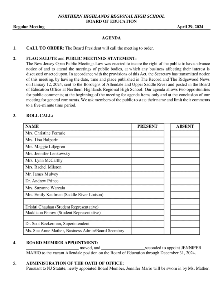 Get the free Northern Highlands Regional High School Board Meeting Agenda