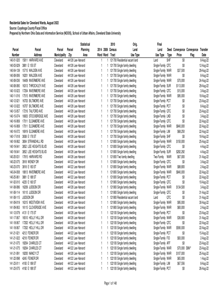 Residential Sales for Cleveland Wards, August 2022 Source: Cuyahoga County Fiscal Office Prepared by Northern Ohio Data and Information Service (NODIS), School of Urban Affairs, Cleveland State UniversityParcel