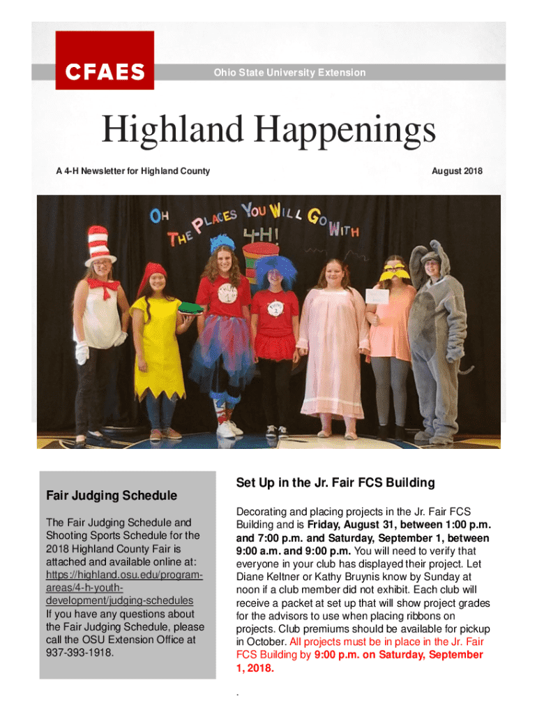 The document provides information and schedules regarding the Highland County Fair, including project setups, contests, and participation details for 4-H members and clubs, along with various activities
