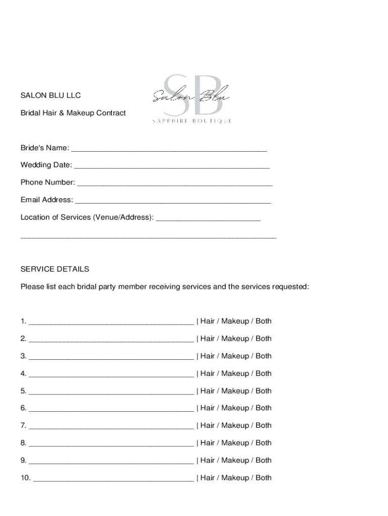 A bridal hair makeup contract form serves a crucial role in the wedding planning process. It outlines the terms and expectations between the bride and the makeup artist, creating a clear understanding of services rendered. In an ambiance where emotions run high and details matter, having everything documented in a contract can minimize misunderstandings and stress.