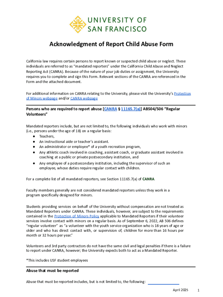 This document serves as an acknowledgment for mandated reporters to report known or suspected child abuse or neglect under California law, specifically within the context of the University and the