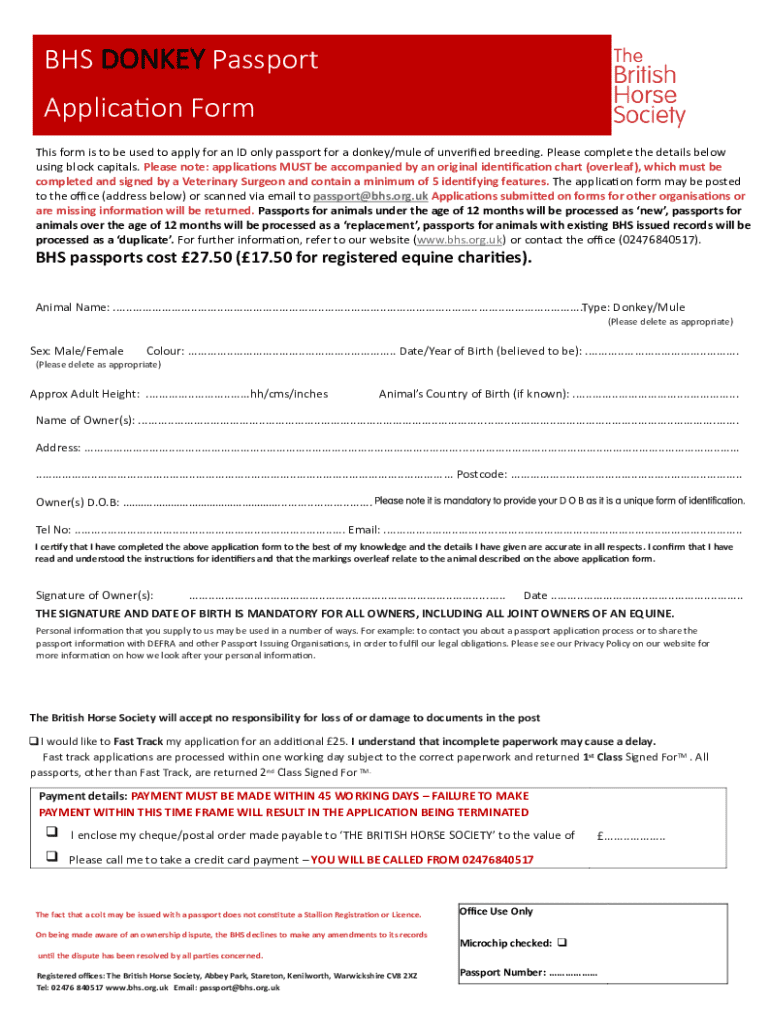 Get the free Bhs Donkey Passport Application Form