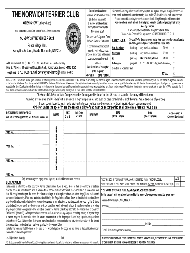 Filling out the Norwich Terrier Club Open Form requires careful attention to detail. Start by gathering all necessary personal information, including your name, contact number, and any relevant identification details. Next, you’ll need specific data regarding your Norwich Terrier, like breed registration numbers, health history, and previous show results, if applicable.