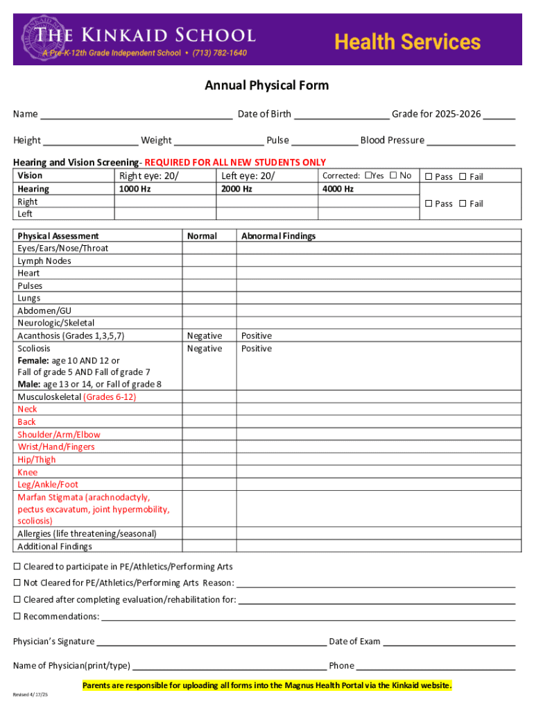An annual physical form is a crucial document that captures an individual's health information, ensuring that medical professionals have a detailed understanding of their patients before conducting examinations. The primary purpose of this form is to facilitate comprehensive healthcare assessments, allowing doctors to make informed decisions regarding diagnoses and treatment plans.