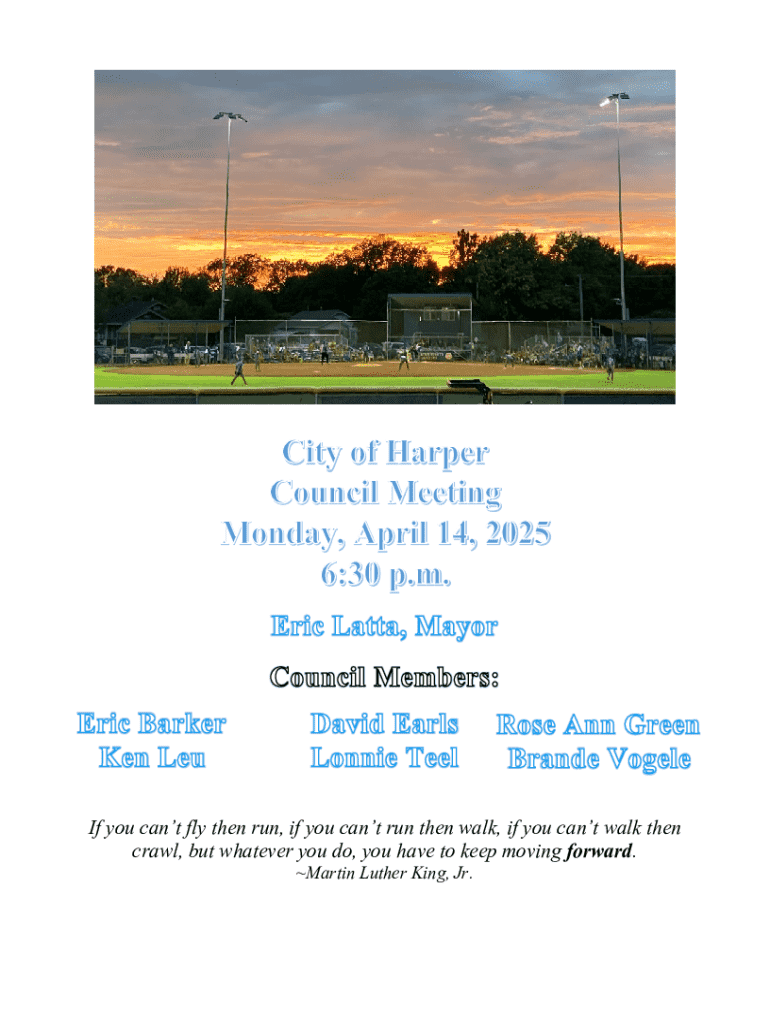 This document contains the agenda for the City of Harper council meeting, including items for discussion, actions to be taken, and various reports from city departments.