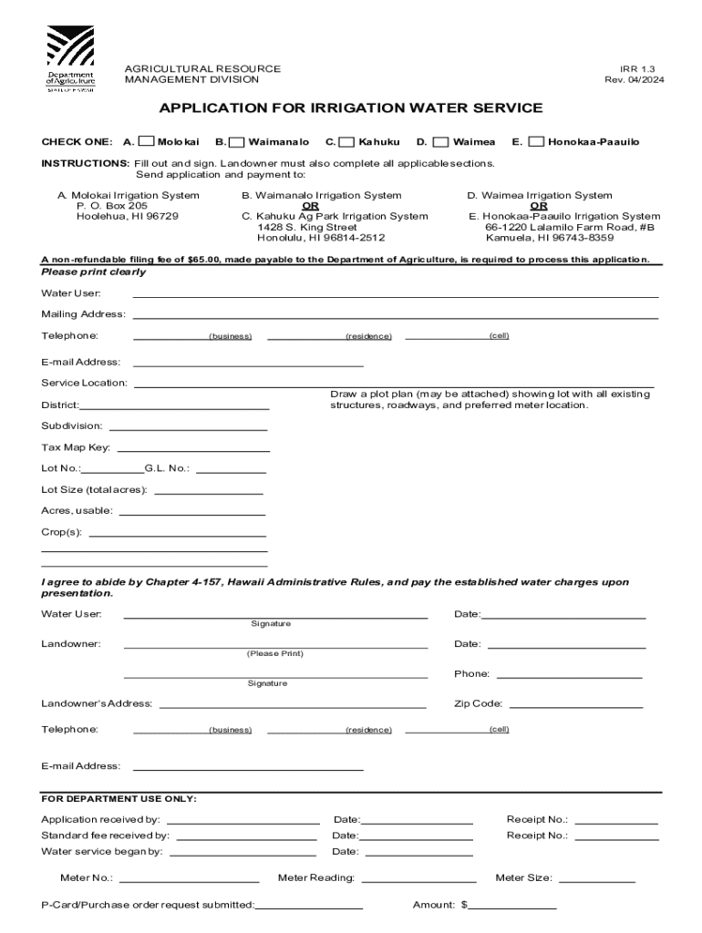 When filling out the application for irrigation water form, precise attention to detail is crucial. The application typically includes key sections such as personal information, land details, water requirements, and farming practices. Providing accurate data helps ensure that the application is processed efficiently and without delays.