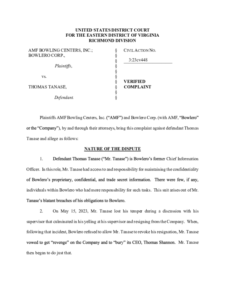This document is a verified complaint filed by AMF Bowling Centers, Inc. and Bowlero Corp. against former employee Thomas Tanase for violating the Computer Fraud and Abuse Act and other breaches such