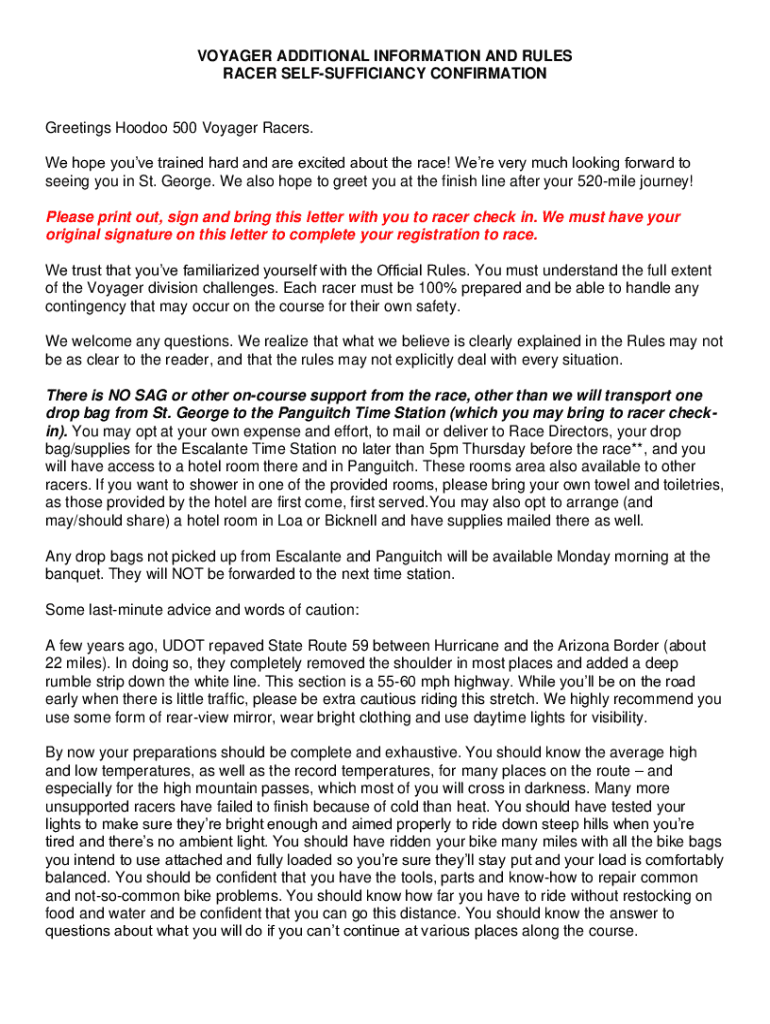 This document contains important information, rules, and requirements for participants in the Hoodoo 500 Voyager Race, emphasizing self-sufficiency and race preparations.