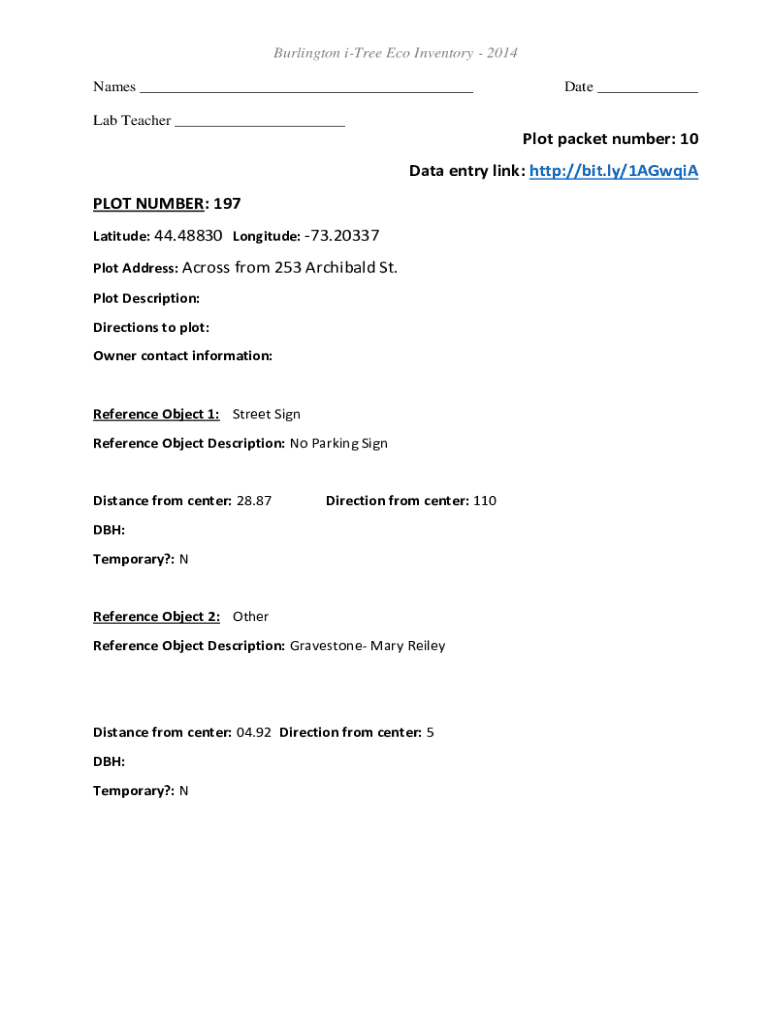 This document provides a structured inventory of ecological data for the Burlington area, including plot information and details about reference objects within a specific geographical location.