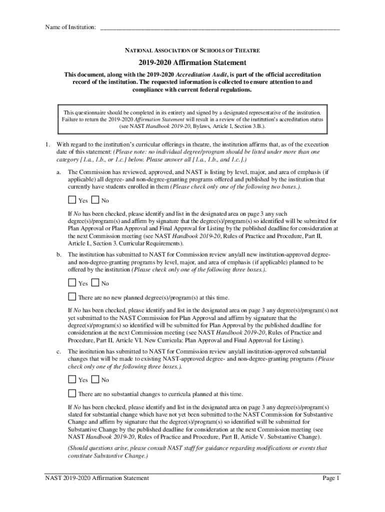 Get the free Nast 2019-2020 Affirmation Statement - nast arts-accredit