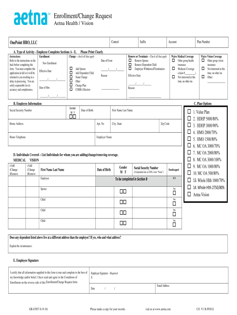 Enrollment/Change Request Aetna Health / Vision Control Endpoint PRO, LLC A. Type of Activity — Employee Completes Sections A E. Instructions: Refer to the instructions on the back before completing