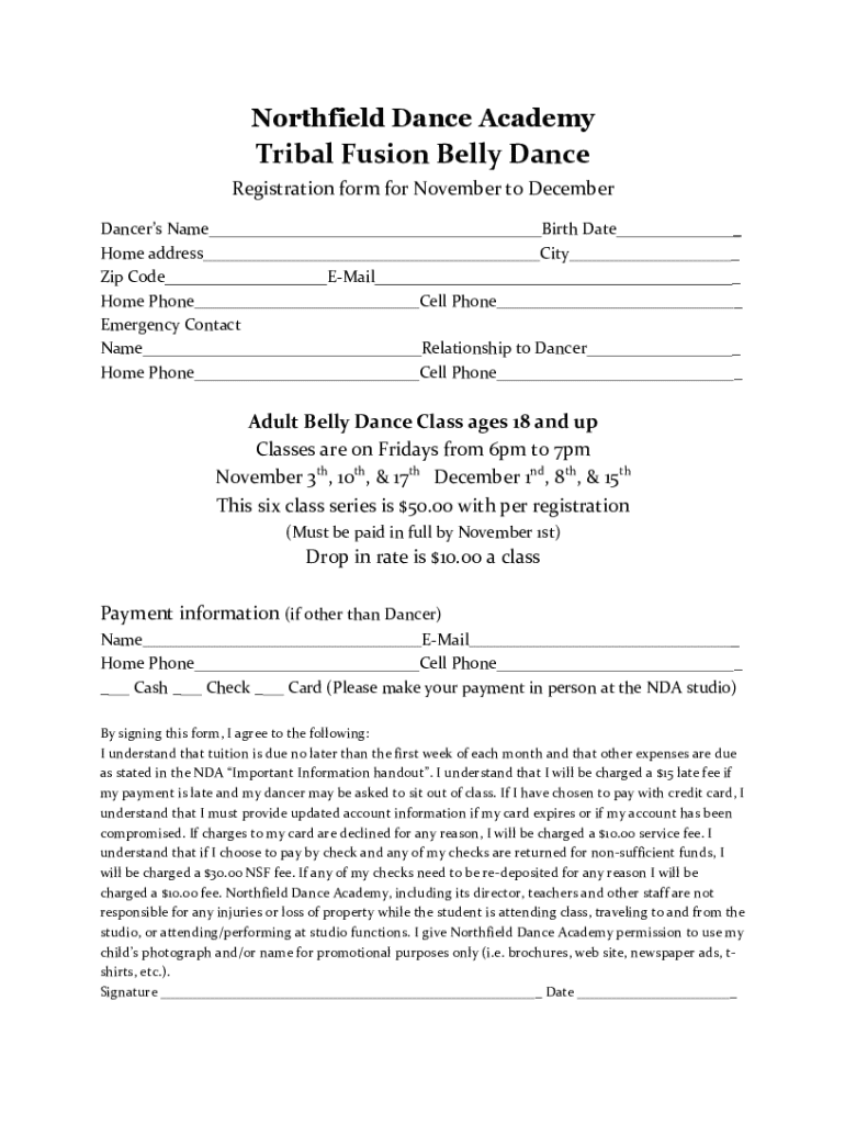 This document is a registration form for the Tribal Fusion Belly Dance classes offered by Northfield Dance Academy for the months of November and December. It collects personal and contact information