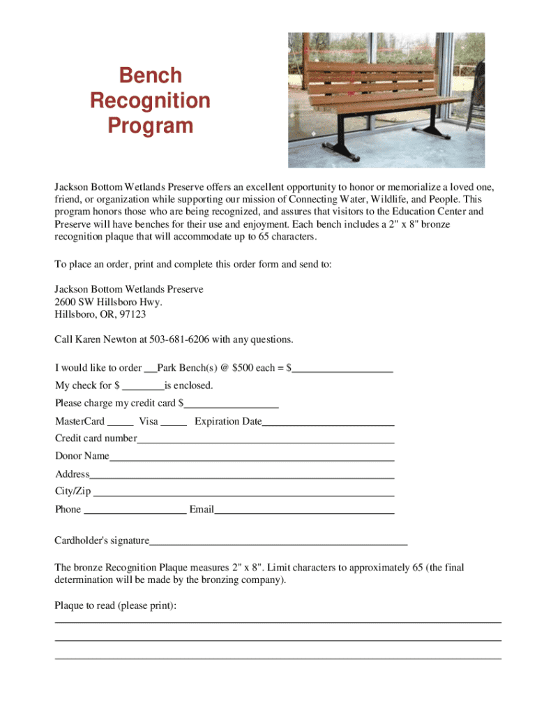 This document serves as an order form for purchasing a bench in honor of someone, including details on payment methods and plaque specifications.
