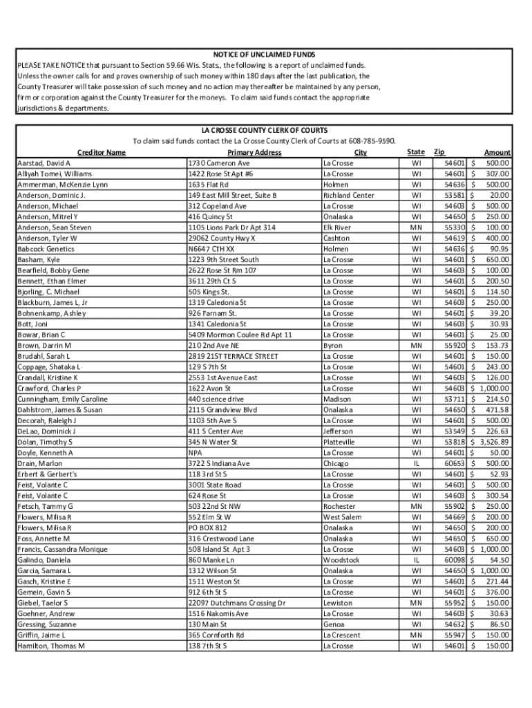Get the free Notice of Unclaimed Funds