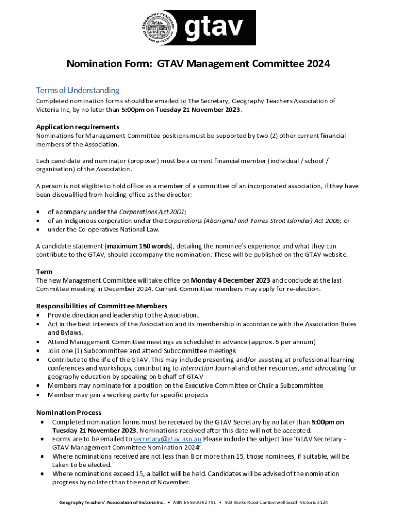 Get the free Nomination Form: Gtav Management Committee 2024