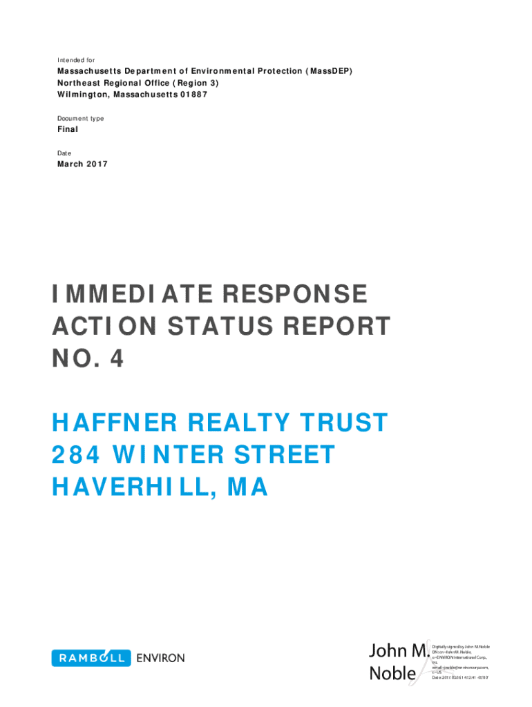 This document is an Immediate Response Action Status Report prepared for Haffner Realty Trust, detailing the actions taken to mitigate environmental impacts at a specified site in Haverhill, Massachusetts,