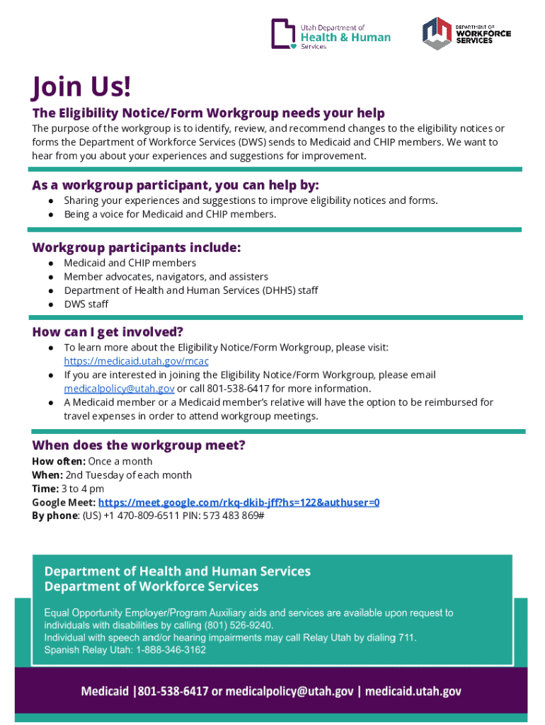 The eligibility notice workgroup flyer form is a crucial document imparting information about the eligibility criteria for various programs, initiatives, or events. This form streamlines communication between stakeholders, ensuring that all parties are aware of their qualifications and the necessary requirements for participation. In contexts such as community development, grant applications, or program enrollments, the eligibility notice operates as a foundational step in fostering transparency and engagement.