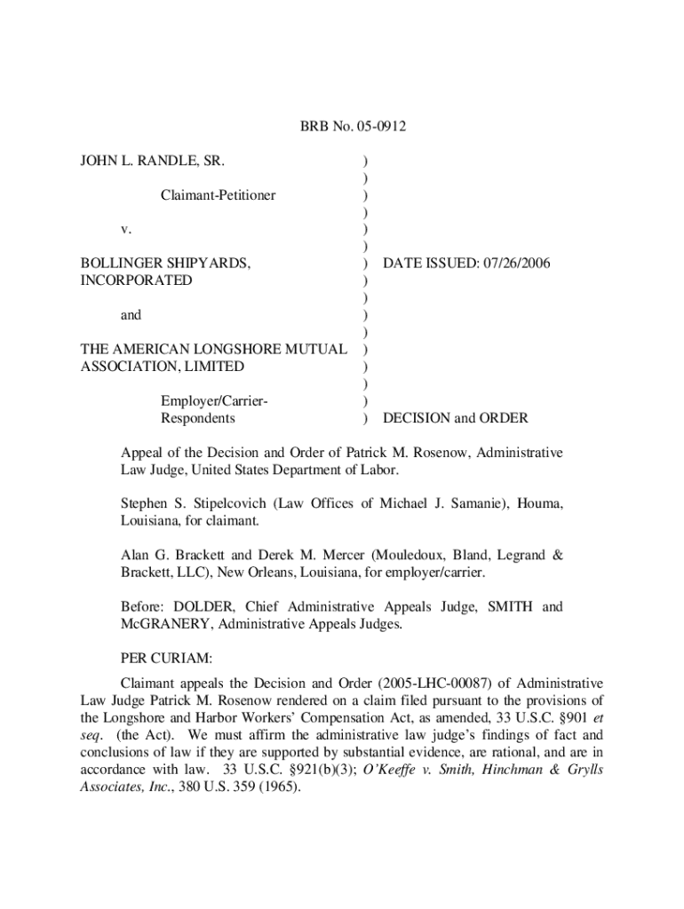 The BRB No. 05-0912 form serves as a vital document for various administrative processes. Created by the Bureau of Workers' Compensation, its primary purpose is to support claims and manage workers' compensation cases effectively. Accurate completion of this form is crucial to ensure that claims are processed smoothly, thus preventing delays in receiving benefits.