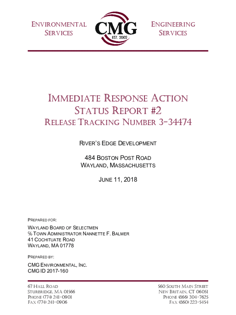 This document is an Immediate Response Action Status Report detailing activities related to environmental remediation at 484 Boston Post Road, Wayland, Massachusetts, for release tracking number 3-34474.