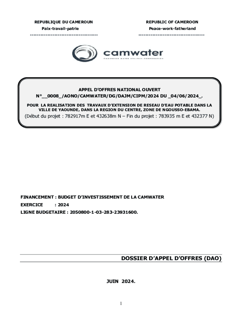 Obtenir le gratuit Appel D’offres National Ouvert N°0008/aono/camwater/dg/dajm/cipm/2024