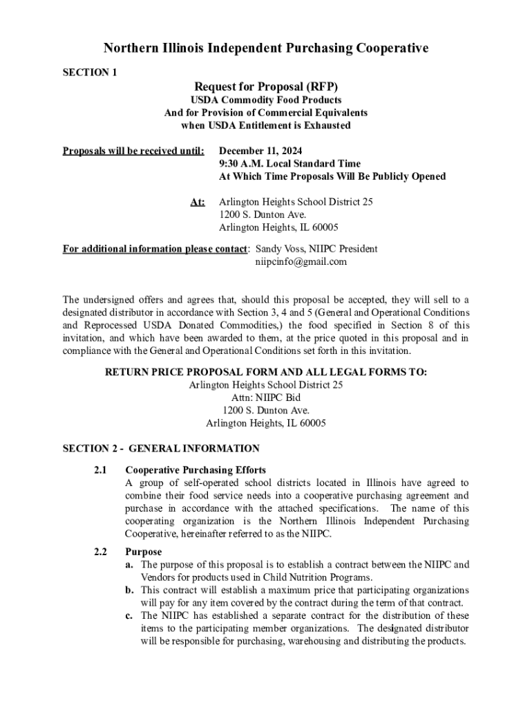 This document outlines the request for proposals for USDA commodity food products and commercial equivalents to be provided to the Northern Illinois Independent Purchasing Cooperative.