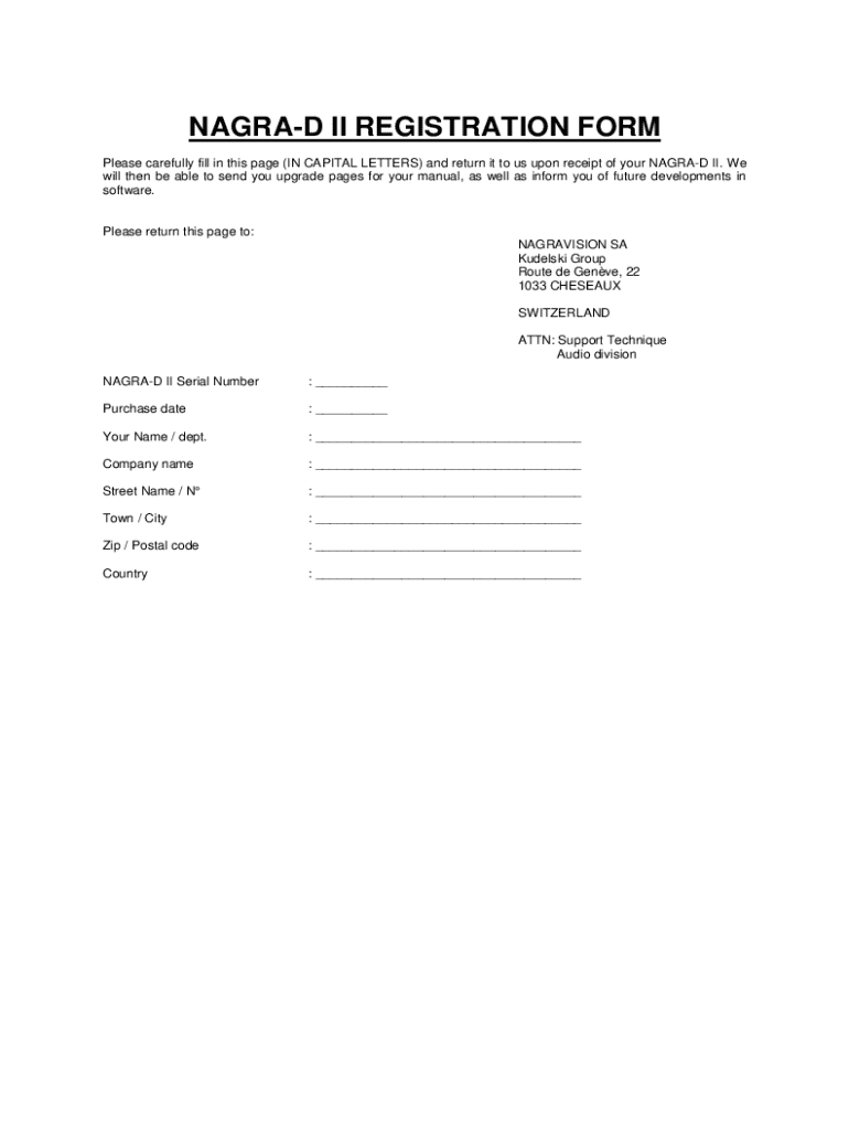 The registration form for the Nagra-D II serves two essential purposes: it secures your warranty and enhances your user experience. By completing this form, Nagra enables direct communication with users regarding software updates, troubleshooting guides, and exclusive access to resources that enhance your recording experience.