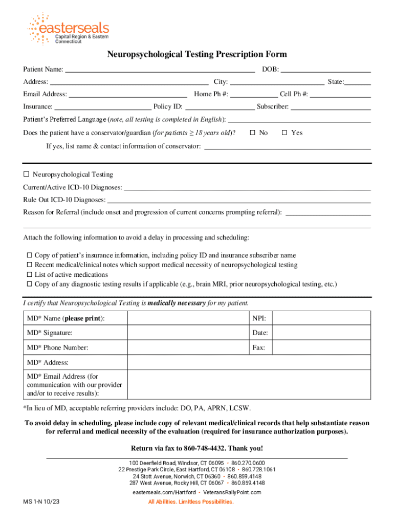 Completing the neuropsychological testing prescription form requires careful attention to detail. Start with the patient’s information — their name, contact details, and insurance information. Next, clearly state the reason for the referral, specifying any concerns about cognitive functions such as memory loss or attention deficits.
